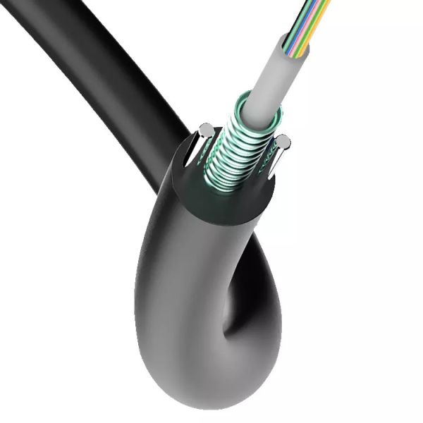 The fibers, 250µm, are positioned in a loose tube made of a high modulus plastic. The tubes are filled with a water-resistant filling compound. The tube is wrapped with a layer of PSP longitudinally. Between the PSP and the loose tube water-blocking material is applied to keep the cable compact and watertight. Two parallel steel wires are placed at the two sides of the steel tape. The cable is completed with a polyethylene (PE) sheath.